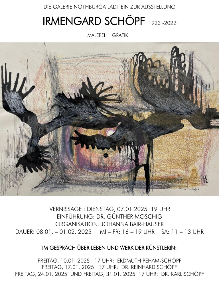 Einladung zu Ausstellung von Irmengard Schöpf in der Galerie Nothburga in Innsbruck, ab dem 07.01.2025